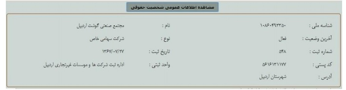 ۱- مجتمع صنعتی گوشت اردبیل« یک شرکت سهامی خاص است که با سرمایه ثبت شده ۲۴ میلیارد و ۵۰۰ میلیون ریال منقسم به ۲ میلیون و ۴۵۰ هزار سهم بانام ده هزار ریالی در تاریخ ۱۳۶۷/۷/۲۷تأسیس شده است.