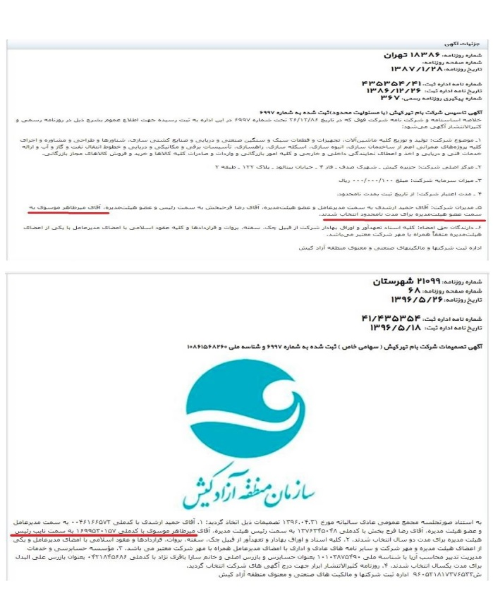«بام تیر کیش» (با مسئولیت محدود)؛ این شرکت در تاریخ ۸۶/۱۲/۲۶در منطقه آزاد کیش تأسیس شده و آقای «میرطاهر موسوی» از سهامدار اصلی آن است و شعبه تهران آن نیز در همان محل اقامت «شرکت فرآوران دشت سبز سبلان» قرار دارد و مدیرعامل آن حمید ارشدی است.