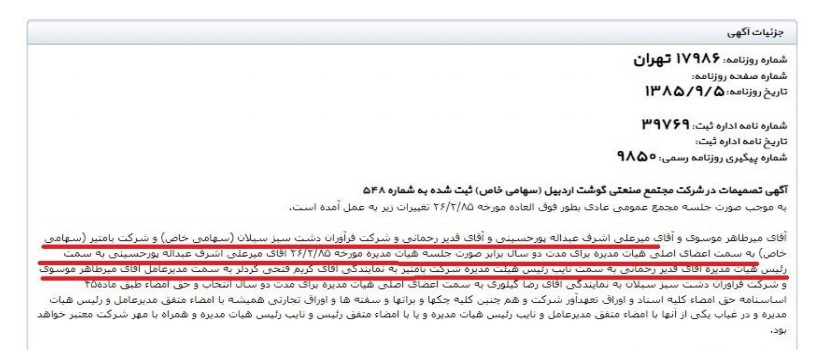 آنچه مسلم است «شرکت بام تیر کیش» از تاریخ ۹۳/۵/۱۵تاکنون عضو اصلی هیات مدیره مجتمع گوشت بوده و«یعقوب عزیز زاده فهیمی» عضو شورای شهر اردبیل و «سیدصالح عبدالله پوری حسینی» برادر «میرعلی اشرف عبدالله پوری حسینی» به نمایندگی از شرکت بامتیر کیش، به ترتیب عضو اصلی هیئت مدیره و مدیرعامل شرکت مجتمع صنعتی گوشت اردبیل و نایب رئیس هیات مدیره شرکت مجتمع صنعتی گوشت اردبیل را برعهده دارند.