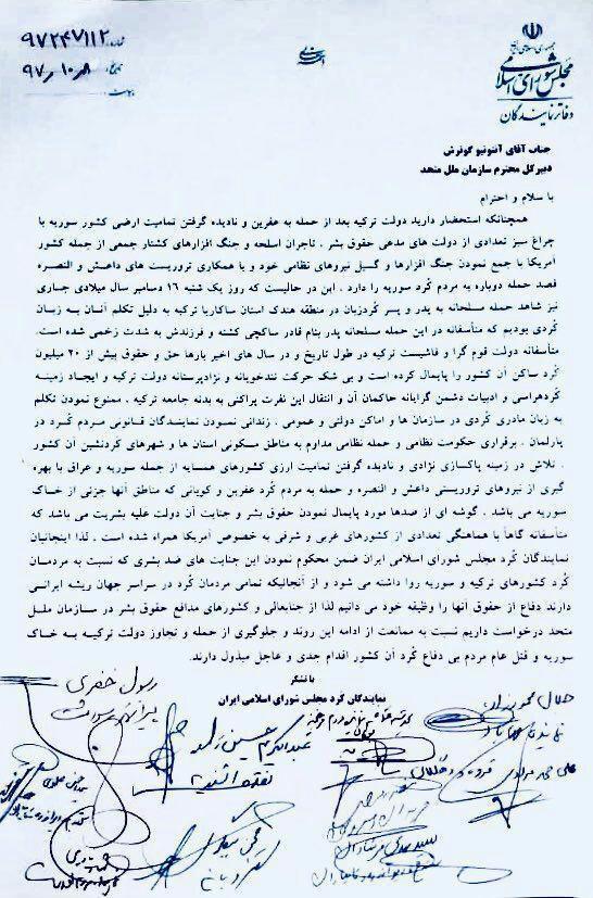 در این نامه که به امضا نمایندگان کرد حاضر در مجلس ایران رسیده است با سیاه نمایی و بدون اشاره به عملیاتهای تروریستی پ ک ک در خاک تورکیه و مرزهای این کشور، عملیاتهای ضد تروریستی تورکیه که در چهارچوب قوانین و قواعد بینالمللی صورت گرفته را عملیاتهایی علیه ملت کورد قلمداد کرده است .