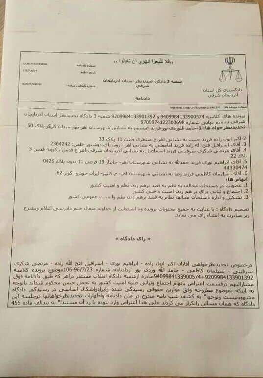 بنابه اطلاع آرازنیوز؛ شعبه سوم دادگاه تجدید نظر استان آزربایجان شرقی به ریاست قاضی بهلول علیزاده که روز شنبه ۱۰ شهریور ۱۳۹۷ با حضور چهار فعال ملی-مدنی تورک تشکیل جلسه داده بود امروز یکشنبه ۱٨ شهریورماه ۱۳۹۷ با صدور و ارسال دادنامهای حکم بدوی ۶ تن از ۷ فعال فراخوانده شده را عینا تأیید کرد.