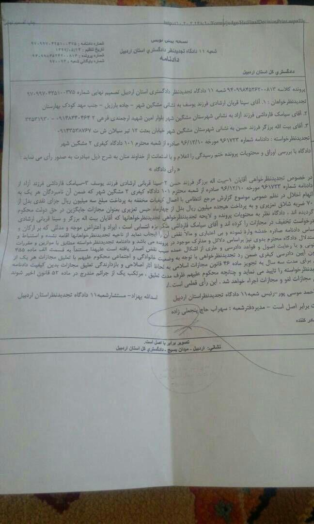 حسن مولایی رئیس شعبه ۱۰۱ دادگاه کیفری۲ مشکین شهر که پرونده این فعالین را در دست داشته برای مجازات چهار ماه حبس تعزیری این فعالین، جزای نقدی ۱۸ میلیون ریالی را به عنوان مجازات جایگزین در نظر گرفته بود. همچنین برای ۷۰ ضربه شلاق نیز مجازات جایگزین سه میلیون ریالی در نظر گرفته شده بود. رضا بدلی دیگر فعال ملی-مدنی این پرونده نیز به دلیل «فقد دلیل کافی در پرونده» از اتهامات وارده تبرئه شد.