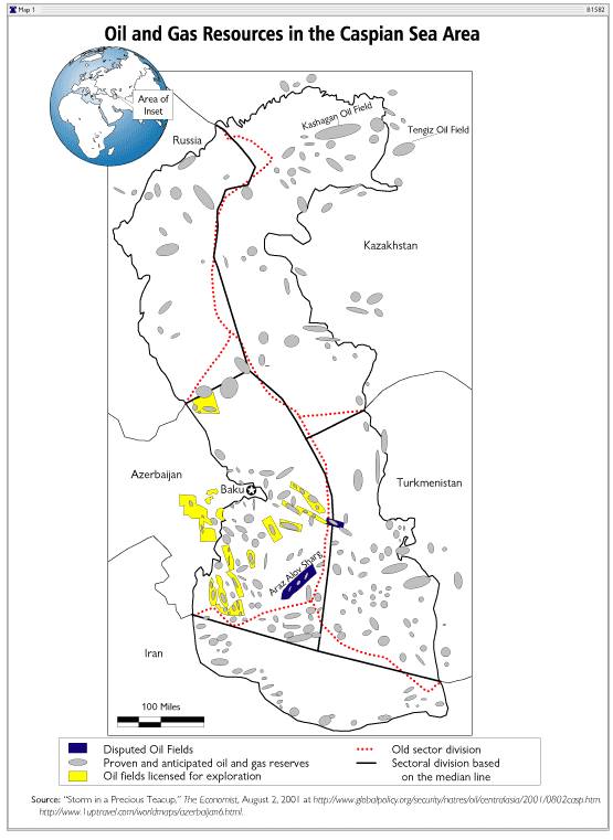 در نقشه فوق، منابع در حال بهره برداری و منابع کشف شده زیر دریای خزر مشخص شده است. دو مورد منابع مورد اختلاف میان ترکمنستان و آذربایجان هم در نقشه مشخص است.