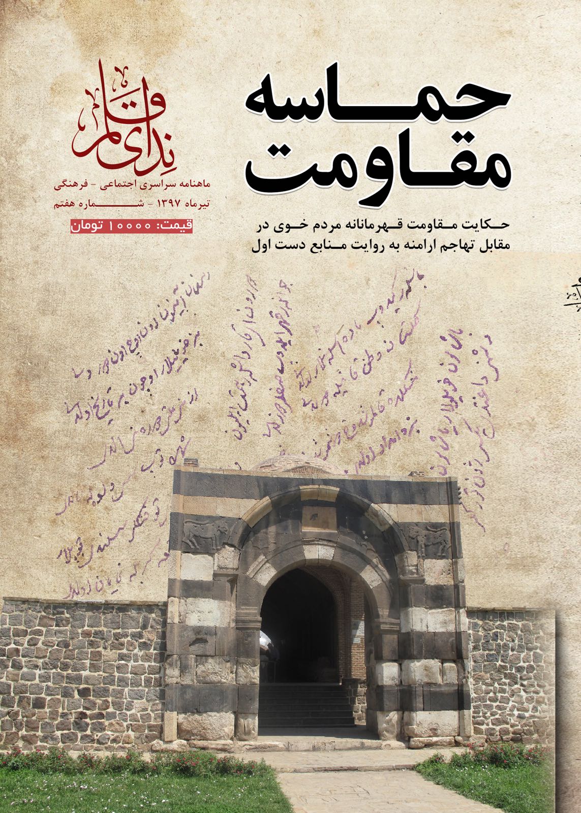 به گزارش آرازنیوز، هفتمین شماره ماهنامه سراسری اجتماعی - فرهنگی ندای قلم با عنوان حماسه مقاومت به موضوع مقاومت قهرمانانه مردم خوی در مقابل هجوم ارامنه اختصاص یافته است.