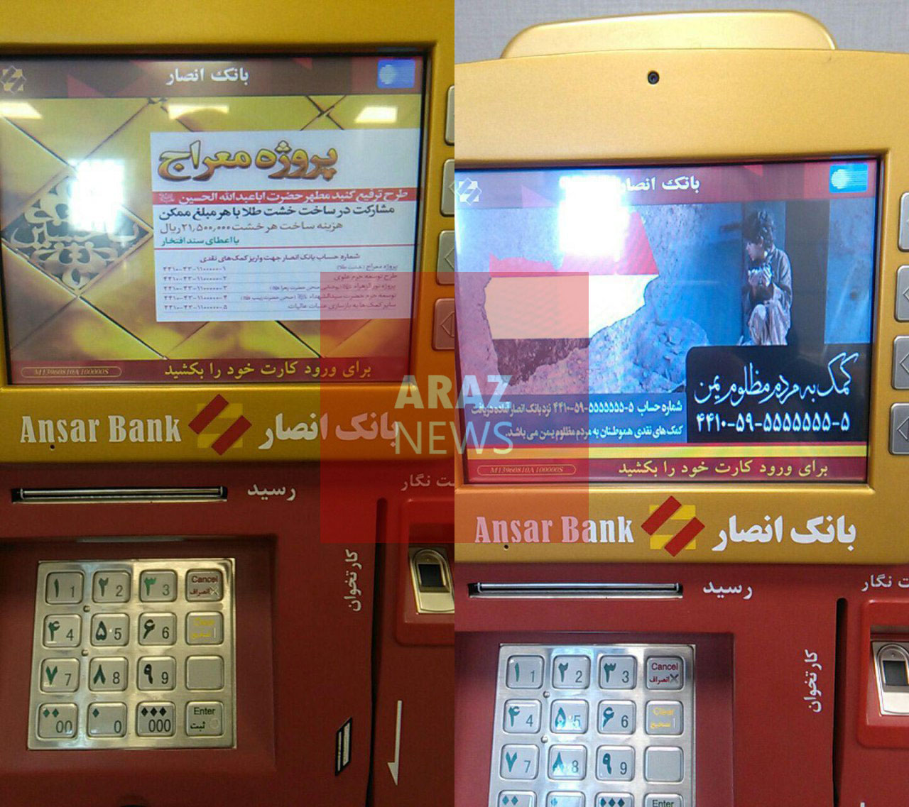 بانک انصار متعلق به سپاه پاسداران انقلاب اسلامی ایران با افتتاح حسابهای ویژه و تبلیغ آنها، در حال جمعآوری پول از مردم تحت عنوان کمک به مردم مظلوم یمن برای گروههای مسلح یمن میباشد. انتقال وجه به حسابهای افتتاح شده نه تنها از داخل شعبات بلکه از باجههای عابربانک نیز قابل انجام میباشد.