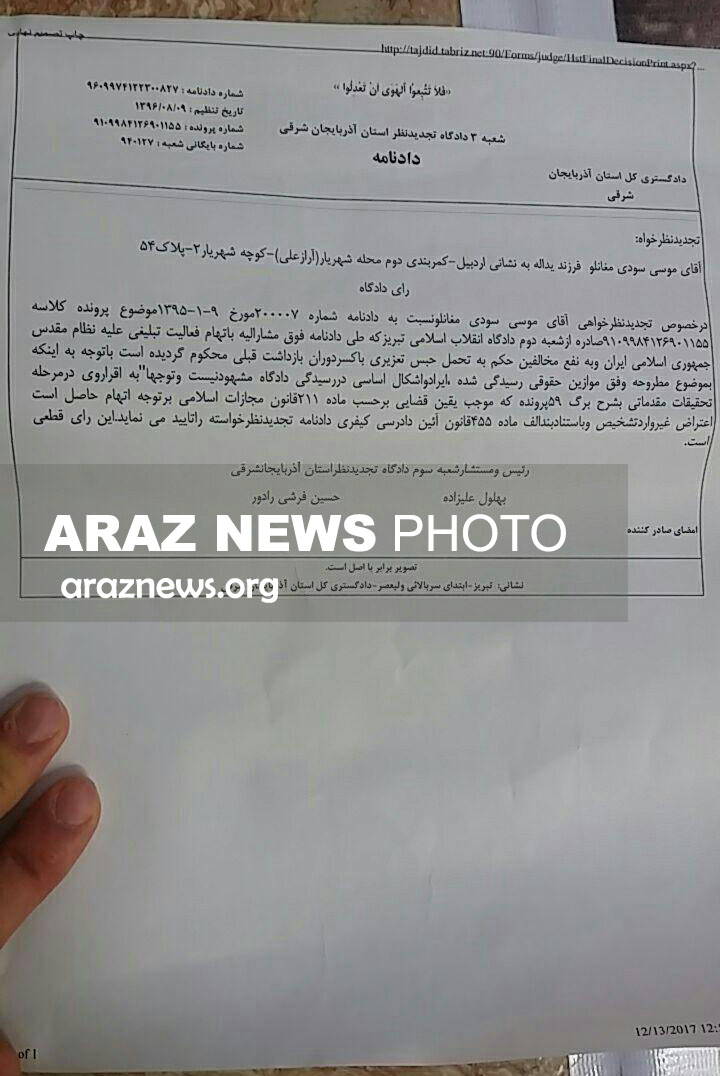 گفتنی است، مهندس موسی سودی فعال ملی – مدنی ساکن اردبیل که در ۱۸ اسفند سال ۹۱ در جریان اولین بازی آسیایی تراختور به همراه چند تن دیگر از جمله جعفر رستمی، علی احمدی و سیامک سیفی و ... بازداشت شده بود. وی به همراه دیگر بازداشت شدگان به اتهام تبلیغ علیه نظام از سوی شعبه دوم دادگاه انقلاب تبریز به هفت ماه حبس تعزیری محکوم شده بود. همین حکم در شعبه ۳ دادگاه تجدید نظر استان نیز عینا تائید شده بود.