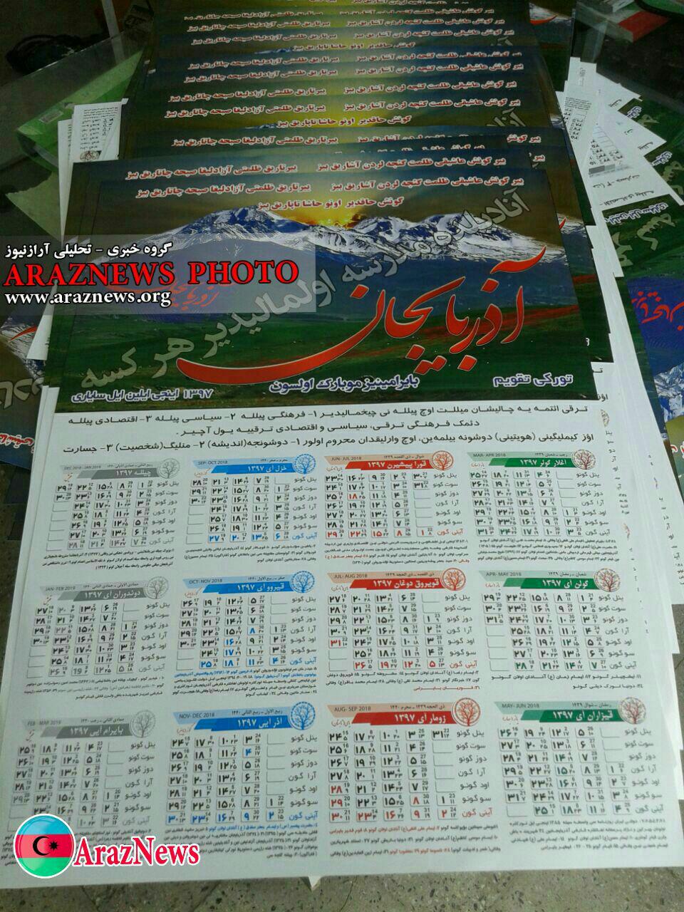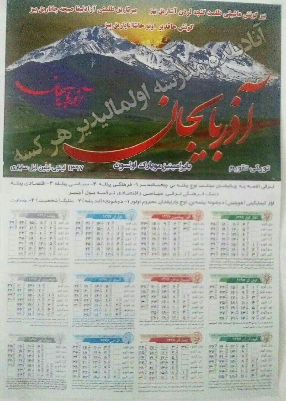 به گزارش آرازنیوز، فعالین ملی آزربایجان با درج شعار« آنا دیلینده مدرسه اولمالیدیر هر کسه» ، «اشعار تورکی» و «اسامی ماههای سال به زبان تورکی» در این تقویم و پخش آن در بین مردم و محل کار در سرتاسر شهر، مقاومت ملی و مدنی ملت تورک آزربایجان را علیه تبعیض نژادی و سرکوبهای فرهنگی به پیش میبرند.