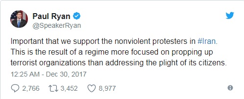 پل رایان، رئیس مجلس نمایندگان آمریکا در نخستین موضعگیری درباره اعتراضها در ایران، در توئیتر خود نوشت: مهم است که ما از معترضان بدون خشونت در ایران حمایت کنیم.