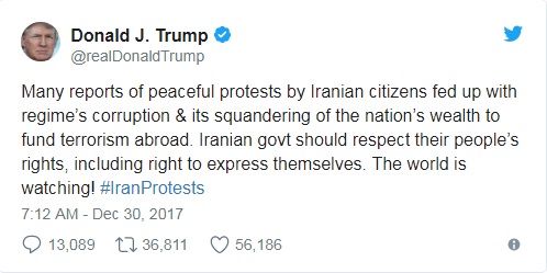 به گزارش آرازنیوز به نقل از VOA در ساعات اولیه شنبه ۹ دی دونالد ترامپ رئیسجمهور آمریکا با انتشار توییتی از صفحه توییتر خویش حمایت خود را از معترضان روزهای اخیر اعلام کرد. ترامپ در حساب توئیتری خود نوشت: گزارشهایی منتشرشده از تظاهرات مسالمتآمیز شهروندان ایرانی، که از فساد رژیم و تلف کردن ثروت ملی برای تأمین مالی تروریسم در خارج به ستوه آمدهاند. وی افزود: حکومت ایران باید حقوق مردم خود را محترم بشمارد، ازجمله حق آنها برای بیان نظراتشان. دنیا به نظاره نشسته است.