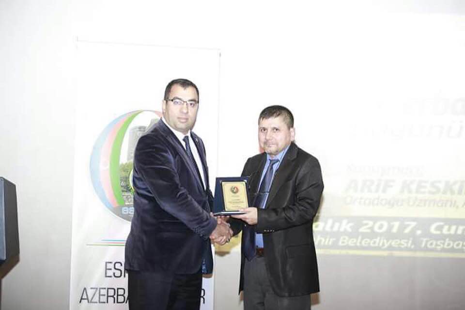 آقای جاوید آیدین مدیر انجمن آزربایجانیها در اسکیشهر در پایان کنفرانس برای تقدیر از عارف کسکین نشان این انجمن را به وی تقدیم کرد.