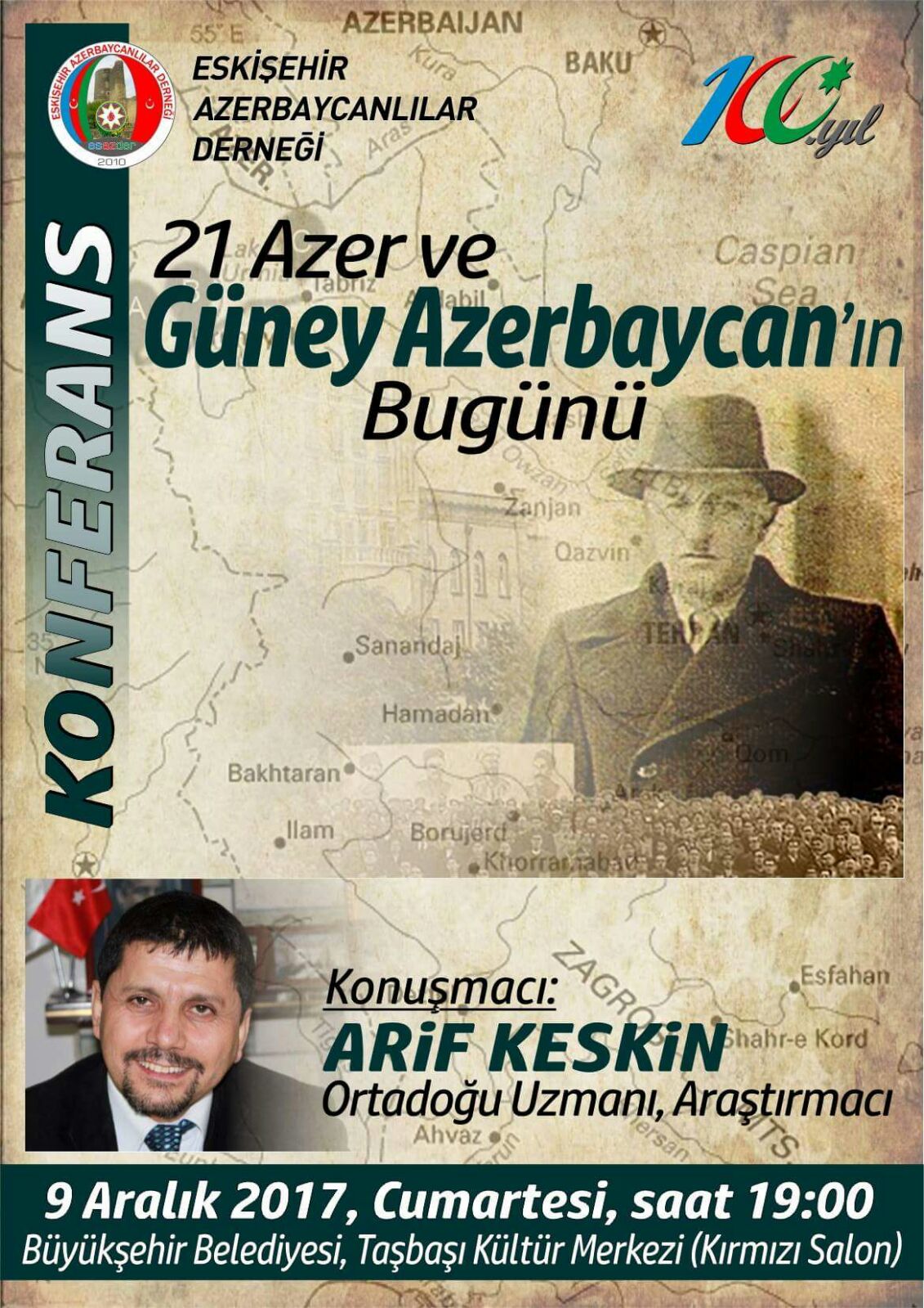 به گزارش آرازنیوز، به مناسبت فرارسیدن ۲۱ آذر سالروز تاسیس حکومت ملی آزربایجان به رهبری سید جعفر پیشهوری نشستی با حضور عارف کسکین پژوهشگر و کارشناس مسائل خاورمیانه در اسکیشهر ترکیه برگزار خواهد شد.