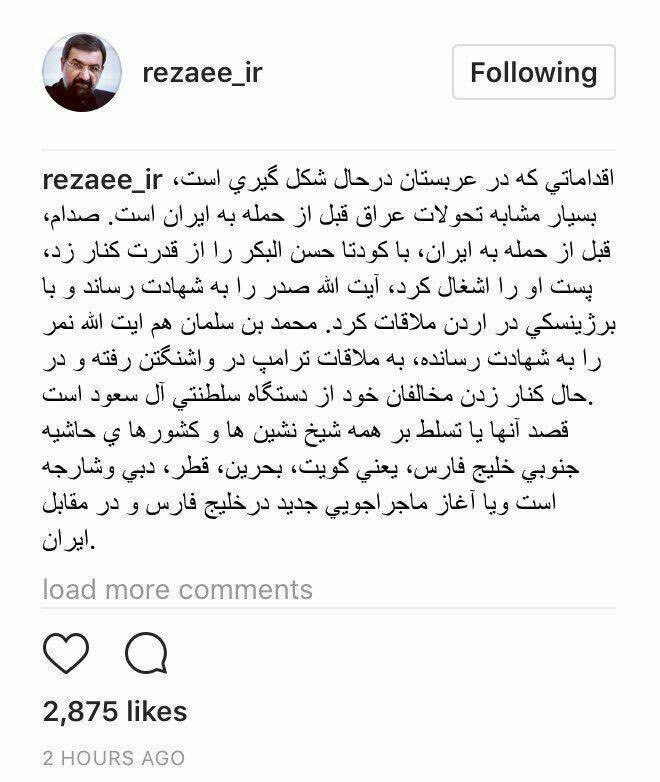 محسن در یک استاتوس اینترنتی تحولات جاری در کشور عربستان سعودی با کشور عراق قبل از حمله به ایران مقایسه و آنها را "بسیار مشابه" ارزیابی کرده است.