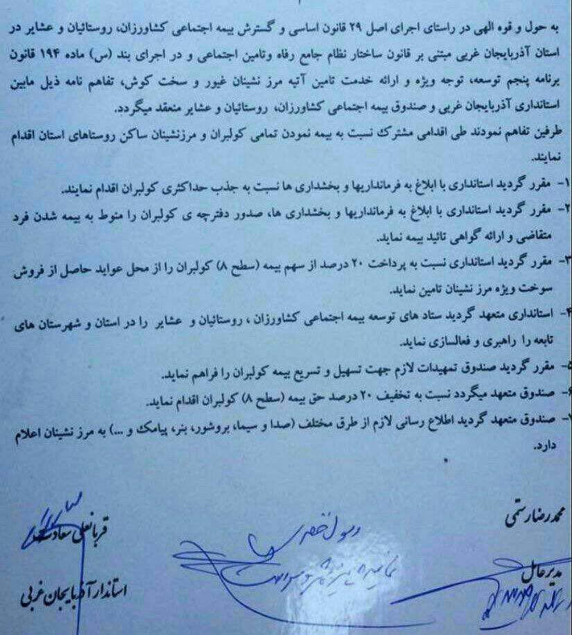 در حالی که آقای سعادت روزهای پایینی استانداری خود را سپری می کند به مانند هم مسلکان اصلاح طلب خود در سال های اول و دو جنگ خلیج عربی مجوز سکونت مهاجرین قوم بارزانی را در غرب آزربایجان صادر کرد و امروز با امضا تفاهمنامه بیمه کولبران قاچاقچی خیانت اصلاح طلبان را بار دیگر در اذهان ملت تورک آزربایجان زنده کرد.