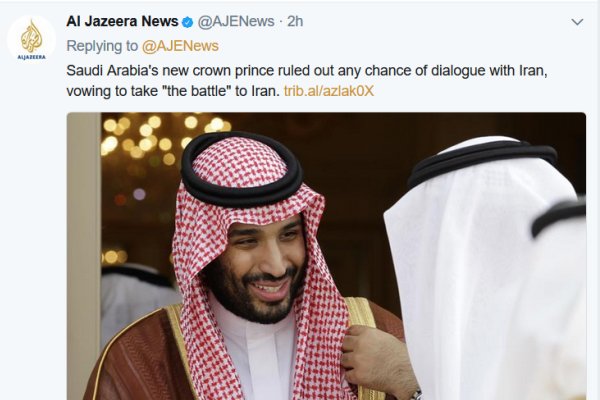 شبکه «الجزیره» در صفحه توئیتر خود نوشته است، محمد بن سلمان ولیعهد تازه عربستان سعودی هرگونه شانس برای گفتگو با ایران را رد کرده و مدعی شده است که جنگ را به ایران خواهد کشید.