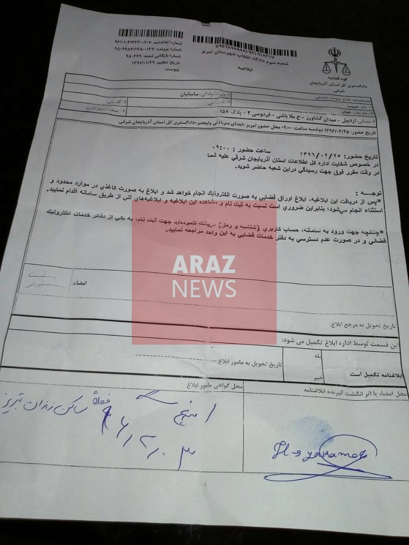 بنابه اطلاع آرازنیوز، حبیب ساسانیان از سوی شعبه سوم دادگاه انقلاب شهرستان تبریز برای تاریخ ۲۵ اردیبهشت احضاریه دریافت کرده است. علت حضور وی در دادگاه شکایت اداره اطلاعات استان آزربایجان شرقی علیه حبیب ساسانیان درج شده است.