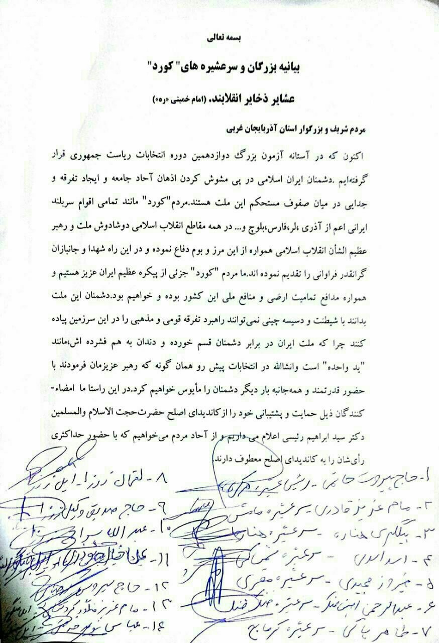 رؤسای عشیرههای کرد در آزربایجان غربی طی انتشار بیانیهای از کاندیدای محافظهکار انتخابات ۲۹ اردیبهشت سید ابراهیم رئیسی حمایت کردند.