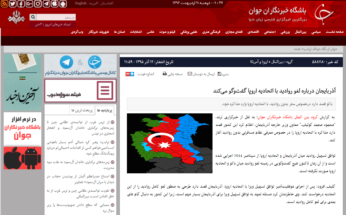به گزارش آرازنیوز، سایت خبری باشگاه خبرنگاران جوان در خبر مربوط به گفتگوجمهوری آزربایجان شمالی با اتحادیه اروپا برای لغو روادید در تصویر خبر از نقشه آزربایجان واحد استفاده و منتشر کرده است که در آن آزربایجان جنوبی نیز به عنوان آزربایجان واحد به نصویر کشیده شده است.