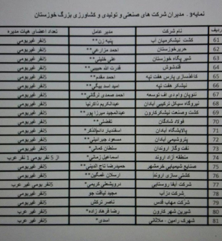 ۳- صرفا ۱۰۸ نفر از ۴۰۵ عضو هیات مدیره های شرکت های فوق الاشاره بومی خوزستان می باشند. یعنی ۲۶ درصد کل اعضای هیات مدیره ها خوزستانی اند.