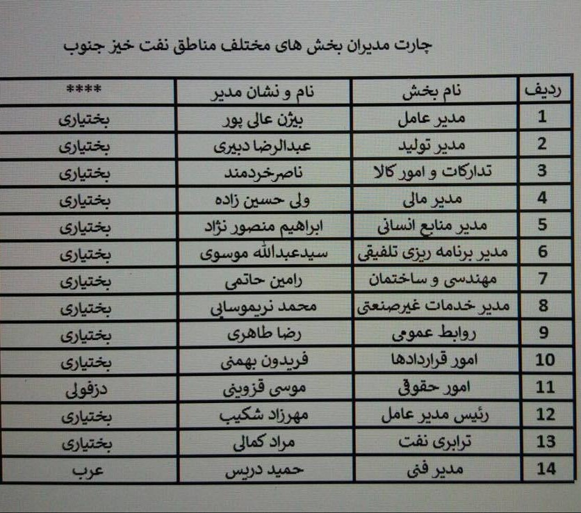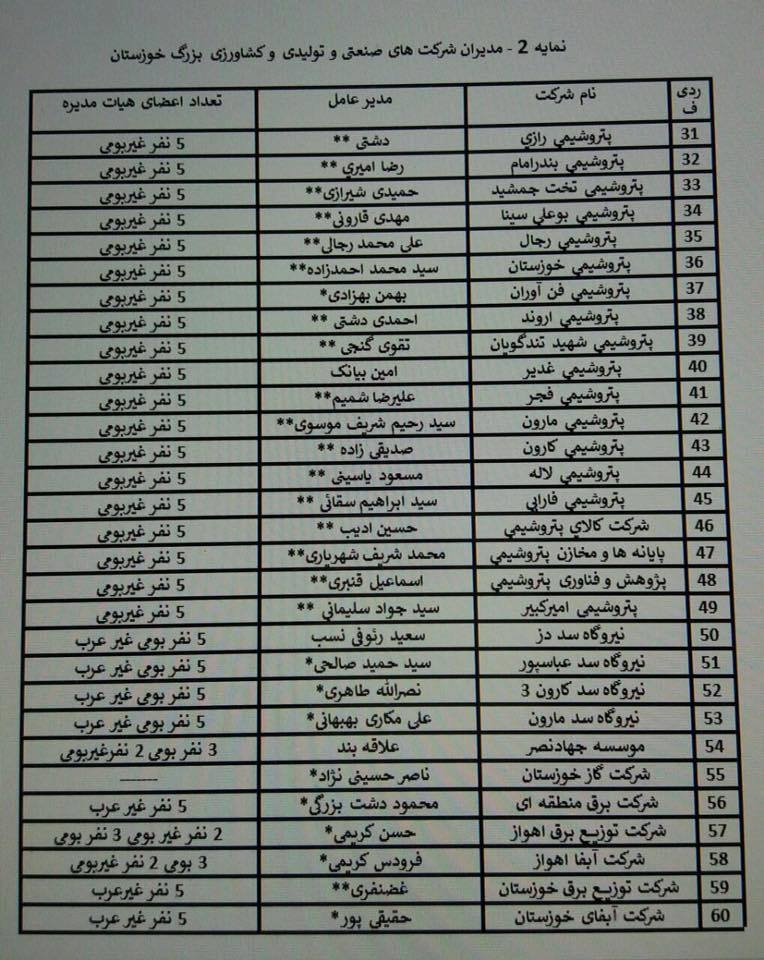 *ملاحظه۱* : دو ستاره نشانه مدیران غیربومی و یک ستاره مدیران لر و بختیاری و بدون ستاره سایر قومیت ها .عبارت غیر عرب برای اعضای هیات مدیره ها یعنی بومی غیرعرب می باشد.