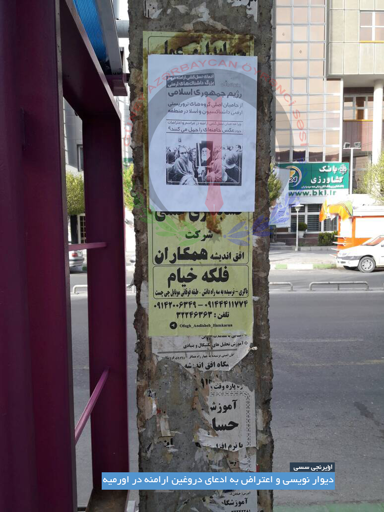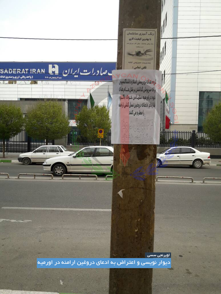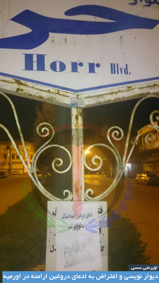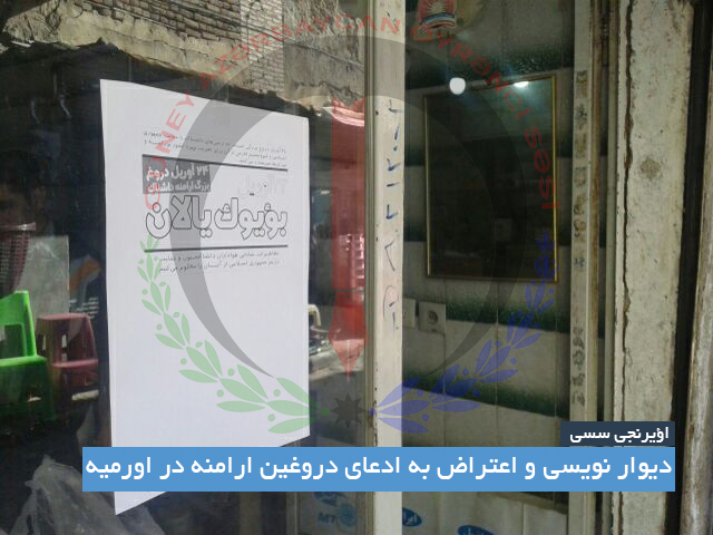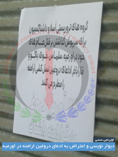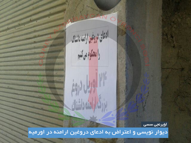 به گزرش وب سایت اؤیرنجی سسی فعالین حرکت ملی آزربایجان و مردم شهر اورمیه با دیوار نویسی و نصب پوسترهایی اعتراض خود نسبت به ادعای دروغین نسل کشی ارامنه و حمایت های جمهوری اسلامی از گروه تروریستی داشناکسیون و ارمنستان را ابراز کردند.