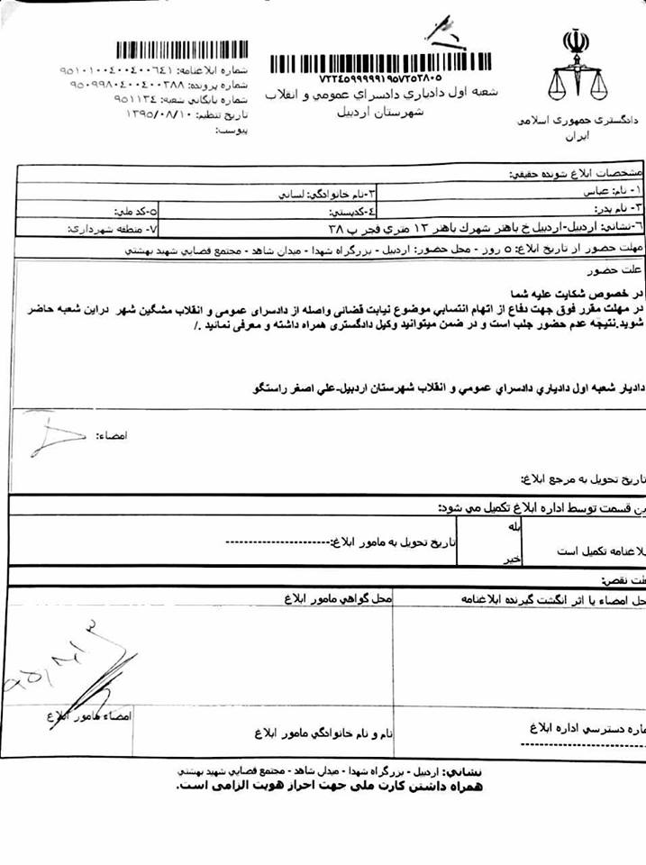 بنا به اطلاع آراز نیوز؛ طی ابلاغیه ای که امروز ۱۳ آبان ماه سال ۱۳۹۵ به منزل آقای عباس لسانی تحویل داده شده است؛ ایشان ۵ روز مهلت دارند در شعبه اول دادیاری دادسرای عمومی وانقلاب اردبیل حاضر شوند.