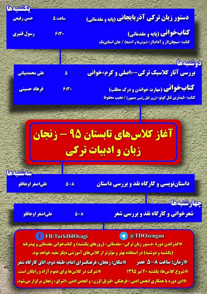 بنا به اطلاعیهای که در صفحه فیسبوک و تلگرام «تورک دیل اوجاغی» منتشر شده است؛ کلاسهای تابستانهی آموزش زبان و ادبیات تورکی در زنجان آغاز شده است.