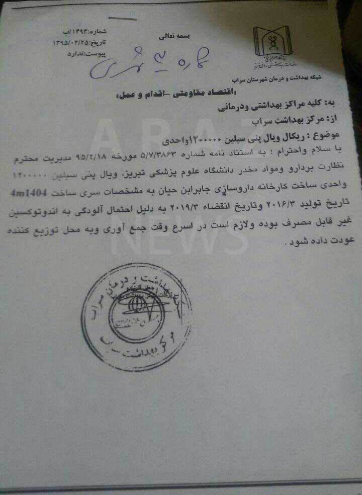 طبق نامهای که به دست آراز نیوز رسیده، مرکز بهداشت سراب به کلیه مراکز بهداشتی و درمانی این شهرستان ابلاغ کرده که ریکال ویال پنی سیلین ۱۲۰۰۰۰۰ واحدی را جمعآوری کنند.