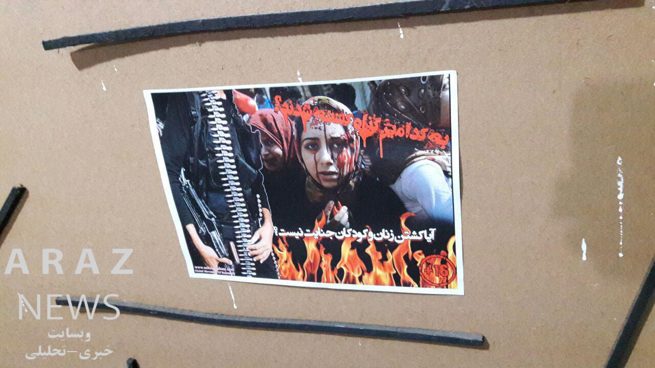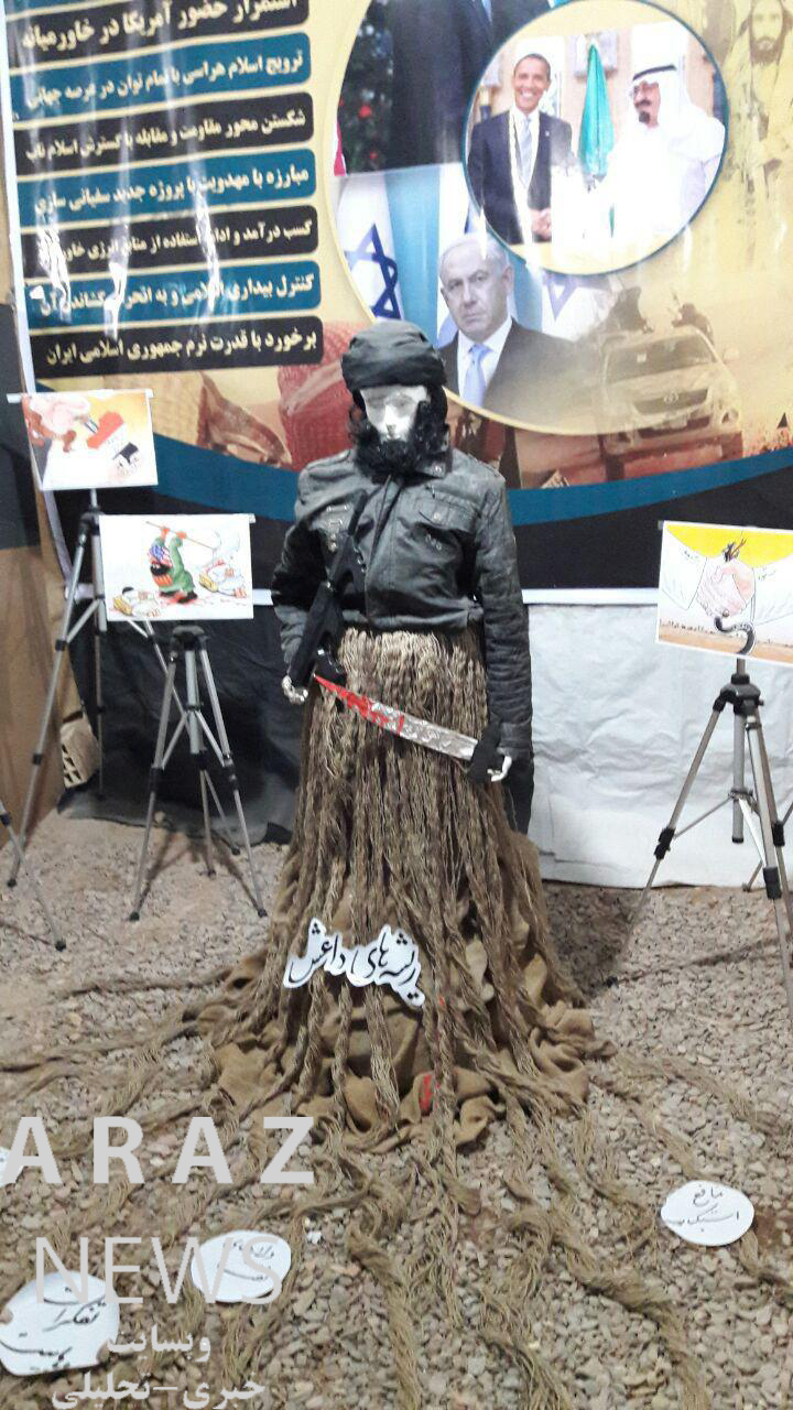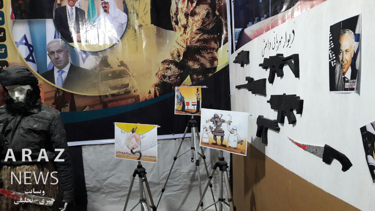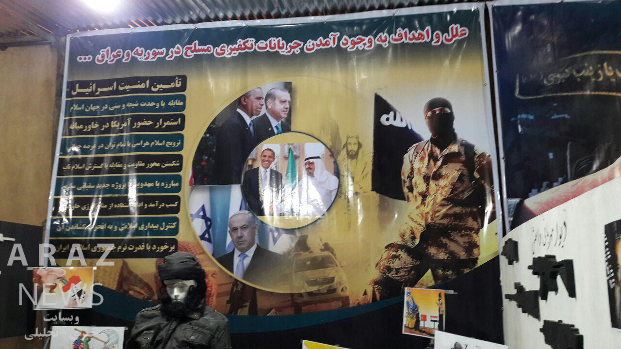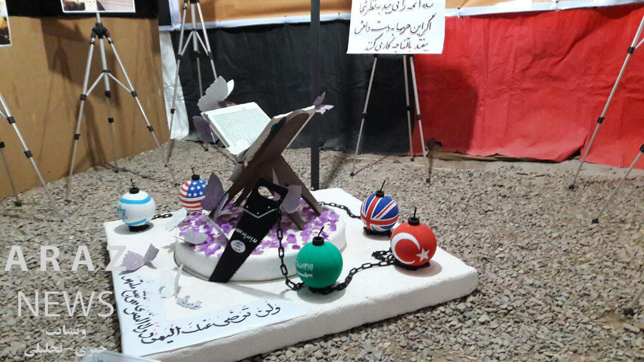 در یکی از ماکت هایی که در این نمایشگاه در معرض نمایش گذاشته شده است پرچم کشورهای آمریکا، اسرائیل، انگلیس، عربستان و ترکیه بر روی بمب هایی نقش بسته است که همگی این بمب ها به دسته اره ای وصل هستند که در حال بریدن جایگاه کتاب مقدس قرآن می باشد و بر روی آن اره نشان گروه تروریستی داعش دیده می شود.